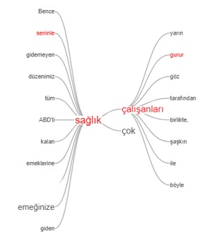 Çalışmaya konu olan aralıkta Twitter’da konum paylaşan kullanıcıların attığı tweetlerin çeşitli ön işleme süreçlerinden geçirilerek toplam 65 bin 535 temiz tweet ile analiz gerçekleştirildiğini kaydeden Cebeci, bu analize göre Sakaryalıların pandemi sürecinin sağlık hizmeti boyutunu önemsediklerinin net olarak ortaya çıktığını söyledi. Cebeci, “Burada ilginç olan ise ‘sağlık’ kelimesi ‘ABD’li’ ifadesi ile sınırlandırıldığında en sık tekrarlanan ‘çalışanlar’ ve ‘şaşkın’ ifadeleridir. Sağlık konusunda ABD’deki şaşkınlığın Sakarya’dan net bir şekilde görüldüğü anlaşılmaktadır” dedi.