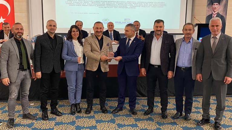 İMKON Genel Başkanı Tahir Tellioğlu, sektöre ve müteahhitler ailesine katkılarından Sakarya Müteahhitler Birliği Başkanı ve İMKON Başkan Yardımcısı Murat Bayrak’a plaket verdi.