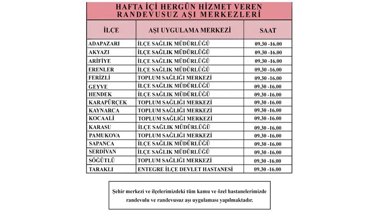 Şehirde Covid-19 ile mücadelede aşılama çalışmaları tüm hızıyla devam ediyor. Kamu ve özel hastanelerde randevulu ve randevusuz aşı olma imkanı bulunurken, ilçelerde de randevusuz aşı merkezleri aşı olmak ve eksik aşılarını tamamlamak isteyen vatandaşları bekliyor. İl Sağlık Müdürlüğü sosyal medya hesaplarından kriterlere uyan tüm vatandaşları aşı olmaya ve eksik aşılarını tamamlamaya davet ederek, ilçe sağlık müdürlükleri ve toplum sağlığı merkezlerinde oluşturulan randevusuz aşı merkezlerini paylaştı. Randevusuz aşı merkezlerinin hafta içi saat 09.30 ile 16.00 saatleri arasında hizmet verdiği belirtildi.