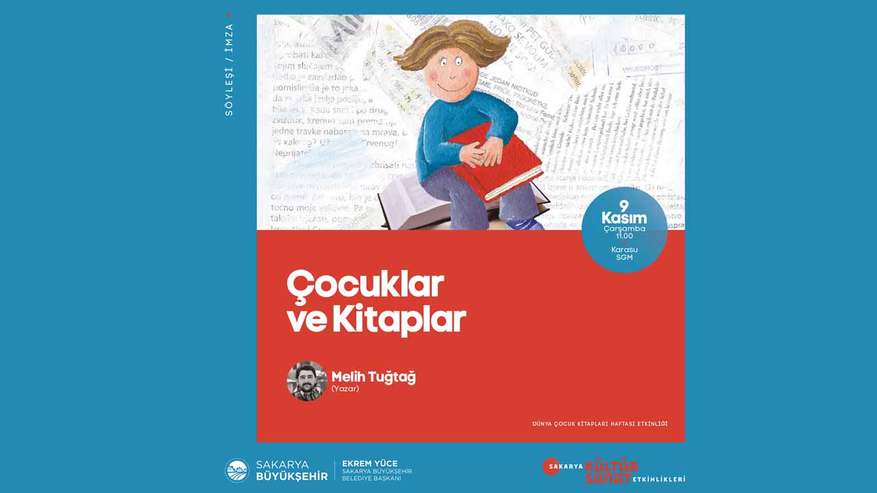 Sakarya Büyükşehir Belediyesi Kasım kültür sanat etkinlikleri ‘Çocuklar ve Kitaplar’ isimli söyleşi ve imza günü programı ile devam edecek. Dünya Çocuk Kitapları Haftası etkinlikleri kapsamında düzenlenecek buluşmaya Yazar Melih Tuğtağ konuşmacı olarak katılacak. 9 Kasım Çarşamba günü saat 11.00’da başlayacak etkinlik Karasu SGM’de gerçekleştirilecek.