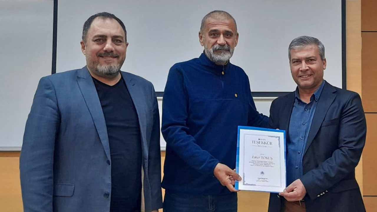 Söyleşi, İletişim Fakültesi Dekanı Prof. Dr. Yusuf Adıgüzel’in Medyabar Kurucusu Zafer Tokuş’a teşekkür belgesi vermesinin ardından sona erdi.