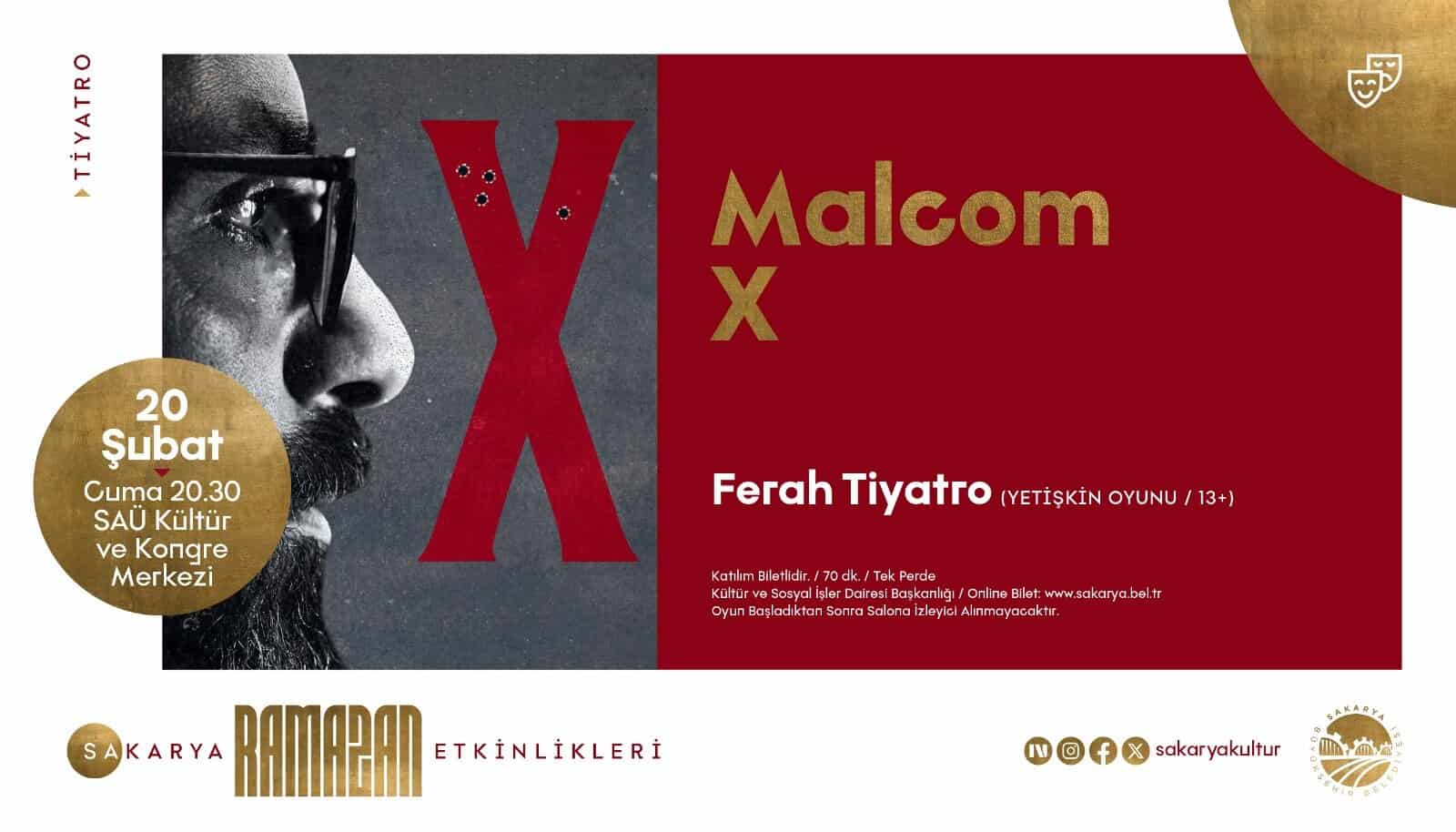 Günün ikinci etkinliğinde ise Ferah Tiyatro tarafından sahnelenecek “Malcom X” adlı yetişkin tiyatro oyunu, saat 20.30’da Sakarya Üniversitesi Kültür ve Kongre Merkezi’nde izleyicisiyle buluşacak. Tek perdeden oluşan oyun, güçlü anlatımıyla tiyatroseverlere etkileyici bir sahne deneyimi sunacak.