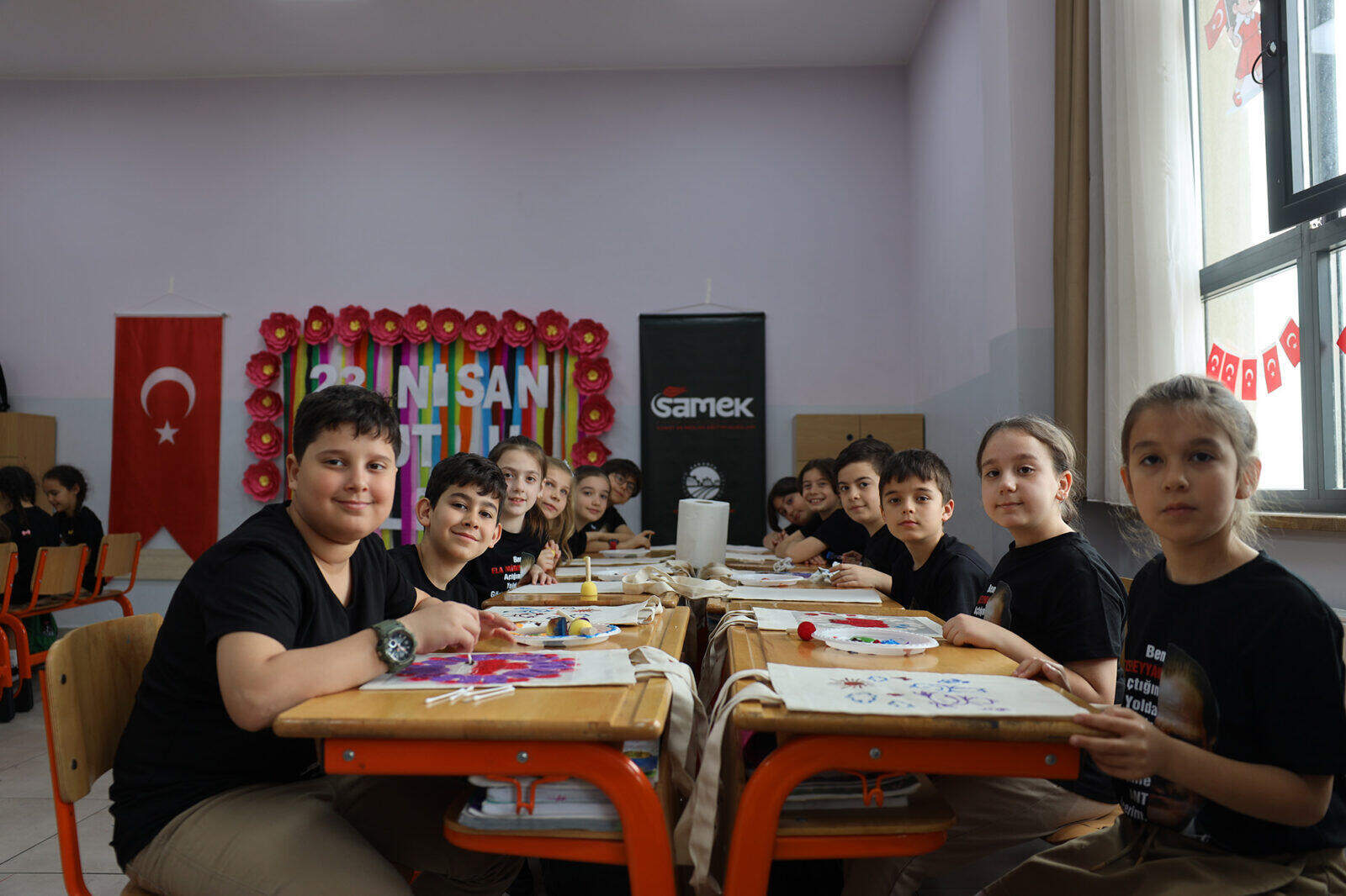 Programda SAMEK‘in uzman eğitmenleri, çocuklarla birlikte kumaş çantalar üzerine Türk bayrağı, balon ve 23 Nisan’a özel figürlerin boyandığı bir atölye çalışması gerçekleştirdi. Öğrenciler hem el becerilerini geliştirdi hem de bayram coşkusunu sanat yoluyla yaşadı.